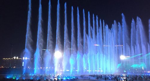 The project consists of five circles and two arcs, the fountain spray height of 40 meters, including digital music fountain, laser fountain show, air explosion spring and other state-of-the-art water performance forms. Xiaohu Scholar Pavilion is the main viewing point, the project has been put into use, attracting a large number of tourists from home and abroad.