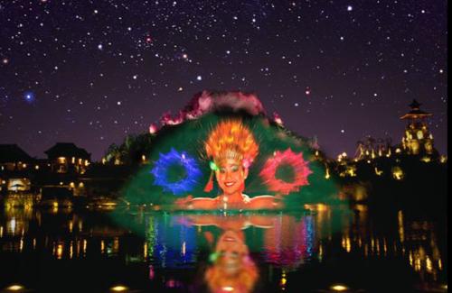 The water curtain film uses water as a medium to spray water from the bottom to the top through a high-pressure water pump and a special nozzle to atomize the water to form a fan-shaped “screen”. The film is imaged on the atomized screen. . When watching the movie, the fan-shaped water curtain blends with the natural night sky. When the characters enter and exit the picture, it seems that the characters are flying up to the sky or falling from the sky, creating a feeling of emptiness and dreaminess.